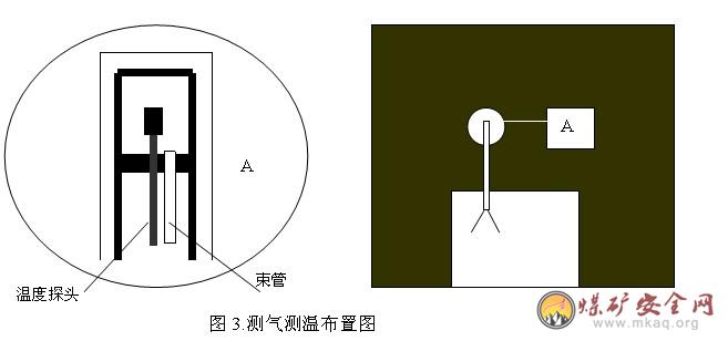 顶煤出现自然发火隐患后,为了掌握灾情发展变化趋势,在顺槽中每50m向顶煤打一探气孔至煤层顶板,埋入一个测气测温装置,如图3所示,定期抽取煤层顶板的气样分析,并监测顶板的煤(气)温。根据气体及温度的变化趋势准确
