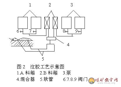 注胶设备放置在火源点附近巷道中,有2台TBW-50/15型泥浆泵,0.5m3水箱4个,两个水箱为一组,并用Ф50mm胶管串联到与泵的入口相连,并通过阀门控制,交叉注胶,从而保证注胶的连续性,通过两台泥浆泵将两基料溶液压入混合器,使两种溶液混合均匀,再通过注胶输出管路压入注胶钻孔,可同时压注2