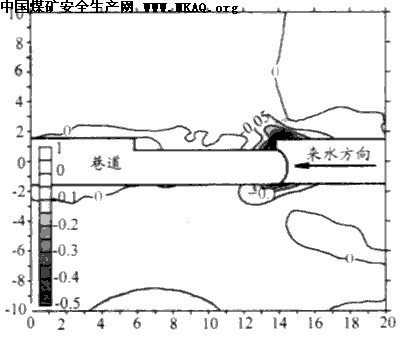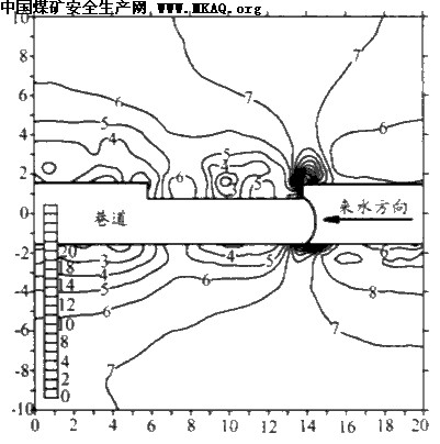根据图4,巷道水闸门承压后,最大等效应力位置出现在水闸门与混凝土接合处。此处混凝土虽然没有开裂,但应力较高,应采取措施,保证该部位的配筋及混凝土浇注质量。