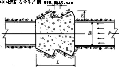本次设计的水闸门主要采用倒截锥形,见图1,其承受水压力为1.6MPa以上,根据水闸门位置的围岩条件、巷道截面、水压力、混凝土强度和采用的墙体段数,可计算出闸门墙体长度、嵌入围岩的深度。计算结果一般在8m左右。