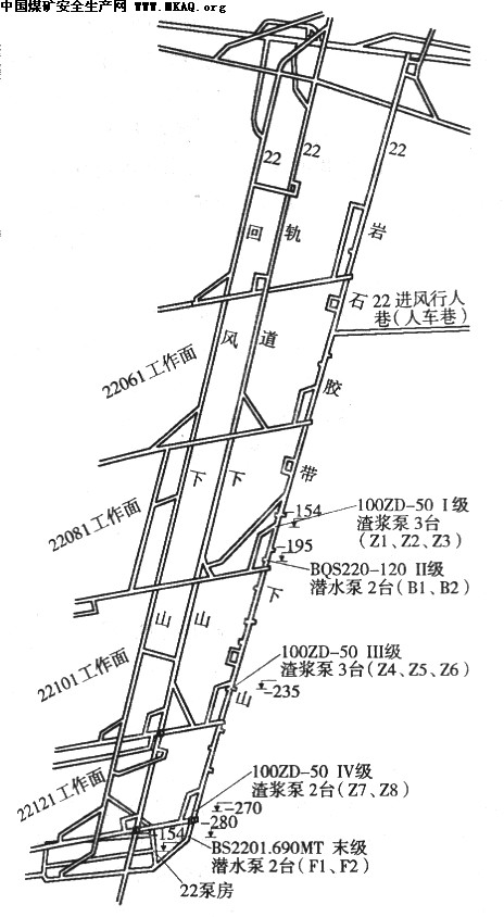 2005年9月3日22采区3条下山(含辅助区段)的恢复工作正式开始,总工程量约3942m。施工工作主要是排水、清淤及巷道的维修。追排水期间以22岩石胶带下山迎头为主排水阵地,安装3台渣浆泵和飞力泵串联向下撵水;22轨道下山和22回风下山安装小型潜水泵排出迎头渗水。在向下撵水恢复过程中,3条下山的水位标高高差不得超过5m。恢复巷道时,不得有露帮露顶现象的发生。在运输方式上,22胶带下山采用胶带运输;22轨道下山前方铺一部SCW-40T刮板输送机,然后通过胶带运输,通过西大巷溜煤眼运出;22回风下山在上