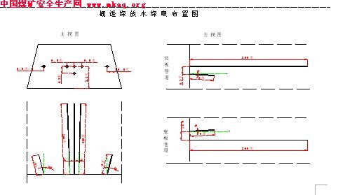 需要钻探的各个掘进头必须用专门的探水钻在掘进头进行钻探,钻探人员必须认真负责,一丝不苟,保证探眼数量和质量,每个掘进头要探够六个眼,中眼一个,边眼两个,辅眼三个,中眼在掘进头距底板1.2米处正中向正前方探200米,两个边眼分别在距离中眼两侧0.5米处向两侧偏1度探200米,左右辅眼在距左右煤帮中部0.5米向两侧偏10度探40米,另外在掘进底板巷道时在距中眼上分0.3米处向上偏5度探40米,掘进顶板巷道时在距中眼下方0.3米处向下偏5度探40米(详细情况见附图)。