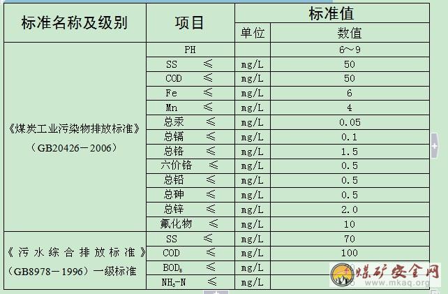 生产用水取自矿坑涌水,矿坑正常涌水量720(30 m3/h),设计采用“石灰乳中和+混凝沉淀+除铁除锰过滤+清水复用”的方案,出水满足《煤炭工业污染物排放标准》(GB20426-2006)采煤废水污染物排放标准限值,处理后的矿井涌水195.01m3/d作生产用水,多余部分外排。