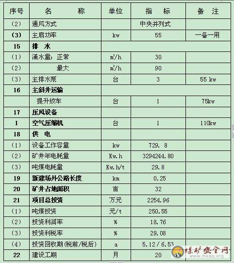 投资:建设项目总投资2254.96万元,吨煤投资250.55元。本项目固定资产投资主要由企业自筹解决。建设项目的税后财务内部收益率16.37%,税后财务净现值728.82万元,税后投资回收期6.53a,投资利润率18.76%,投资利税率29.08%。