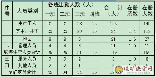 职工人数及年工作天数:煤矿在册职工总人数169人,具体编制情况详见表2-3;年工作日330天。