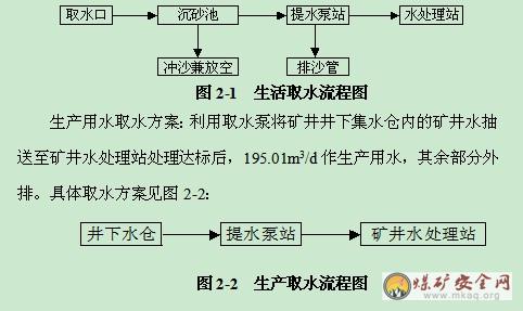生产用水取水方案:利用取水泵将矿井井下集水仓内的矿井水抽送至矿井水处理站处理达标后,195.01m3/d作生产用水,其余部分外排。具体取水方案见图2-2: