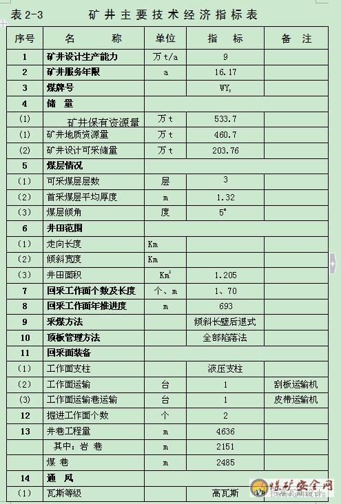 矿井主要技术经济指标见表2-3。