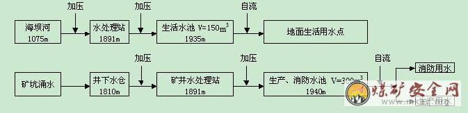 煤矿供水系统共分为3个系统,即生活用水供水系统、生产用水供水系统和消防用水系统。供水系统见下图: