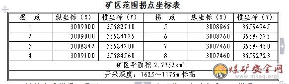 矿界:根据贵州省国土资源厅2004年5月18日颁发的《大方县普底金象煤矿采矿许可证》(证号:5200000410106,有效期限自2004年5月至2014年5月)划定的矿区范围,金象煤矿矿区范围东西倾向长1.415~2.234km,南北走向宽约0.451~1.540km,呈一不规则多边形,矿区范围平面积2.7752km2。其拐点坐标见下表。