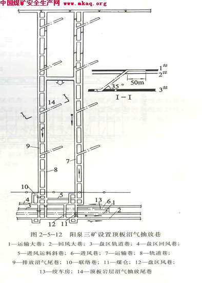 1、2号煤层不可采,但为富含沼气层。相对沼气涌出量为22.4~31.3m3/t,并有煤和沼气突出危险。采用倾斜长壁采煤法开采,在条带排放沼气巷内,距回采工作面开切眼98m处开始,每隔280m开掘一条顶板岩层抽放沼气巷,距回采工作面停采线250m左右停止开掘。其具体布置如图2-5-12所示。