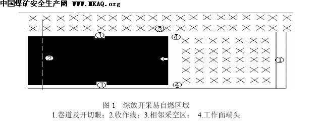发生自燃的因素包括浮煤的存在,煤体破碎,与氧气接触并有蓄热条件和时间。生产中无论采用何种方式方法,破碎煤体的存在以及与氧气接触是不可避免的,但是如能减少破碎煤体的存在并缩短其蓄热时间,自然发火的几率将会大大降低。在这一指导思想下,对传统放顶煤巷道布置系统易发生自燃的区域以及易发生自燃的时段进行分析。按照放顶煤回采系统下各区域发生自燃的几率大小进行等级划分:(1)容易发生自燃区域巷道揭露的相邻原高温区域或老火区、巷道顶板局部冒落区、巷道变坡顶板破碎区,巷道揭露相邻沿空侧的停采线、溜煤眼、联络巷及其它硐室等处。(2)较易发生自燃区域巷道顶煤离层破碎区、沿空侧煤柱破碎区。(3)可能发生自燃区域巷道巷帮破碎区以及工作面采空区。根据对综放开采时自然发火事故出现的频繁程度,确定火灾易发地点依次为巷道及开切眼、末采收作线、邻近采空区、工作面端头,(如图1所示)。自然发火防治工作的另一重点就是从不同的时期进行分析,各个时期的防治工作要从其产生的根源着手,有四个时期最易发生自燃,分别是:(1)掘进期间。巷顶易形成高冒区以及碎煤裂隙带发育带,局部通风机正压作用加剧了氧气在煤体中扩散,深部产生的热量散发困难,是自然发火的隐患之一;