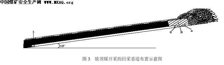 煤矿的生产始终围绕安全、经济、回采率三方面展开,该生产条件下煤层开采受到自燃发火的影响,传统放顶煤沿煤层底板布置巷道以及留煤柱护巷已不能适应生产需要,亟需采用既能提高回采率,又能保证安全生产的无煤柱巷道布置以及相应的回采工艺,本文提出采用错层位巷道布置系统和三段式回采工艺来实现无煤柱开采[2],(如图2所示)。