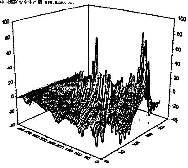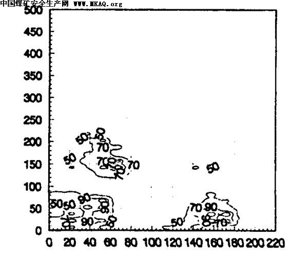 将野外实测的数据应用探火数据外理软件(CDTH)进行处理可得出火区分布平面图。图1、图2为测值立体图及相应等值线图,图3、图4为异常值为立体图及相应等值线图,以此可得出“五虎山煤矿404工作面自燃火源探测平面图”如图5所示: