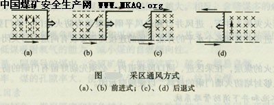 (1)选择合理的采区通风系统。结合开拓方案和开采顺序,选择合理的采区通风方式。前进式回采用图(a)、(b)所示通风系统,后退式回采用图(c)、(d)所示通风系统,这样可以减少采空区漏风量。