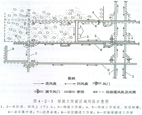 区域均压指使某一区域范围内通风压力大致相等。综放工作面区域均压,主要是实现综放工作面与通过后部采空区相联通的其他采掘工作面及巷道之间的区域内均压、综放工作面后部采空区密闭内外均压。综放工作面区域均压如图4-2-3所示。