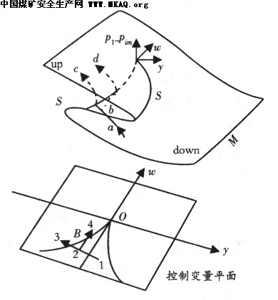 现在构造两个函数:w(?i,Ri)和y(E,ti,P2),其中w是单调减小的;y是分段函数;当P1-Pim>0时,单调增加,当P1-Pim<0时,单调减小(P>im为实际瓦斯压力)。煤与瓦斯突出可以适合尖点突变模型,则其突变势函数为