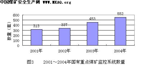 4、监测监控。截止2004年,国有重点煤矿装备了监测监控系统552套(见图3),配备瓦斯、开停、一氧化碳等传感器35064台。45户安全重点监控企业装备了392套安全监测监控系统。其中,高瓦斯、突出矿井全部安装了监测监控系统。