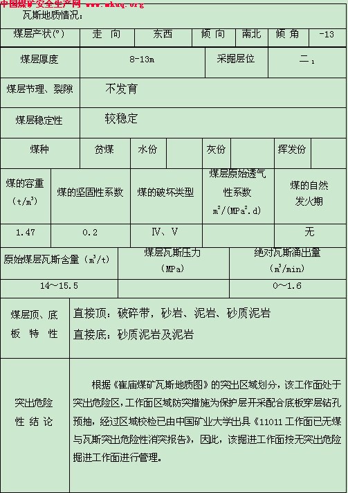 11011工作面已由中国矿业大学对该工作面进行了区域校检,另出具了《11011工作面已无煤与瓦斯突出危险性消突报告》,该工作面已无煤与瓦斯突出危险性,因此,11011工作面煤巷掘进期间执行超前探测、区域验证防突措施。若在掘进或施工措施孔期间遇异常情况(喷孔、夹钻等),工作面以采取本煤层顺层条带钻孔补充区域防突措施为主或以工作面浅孔抽放局部防突措施为主。