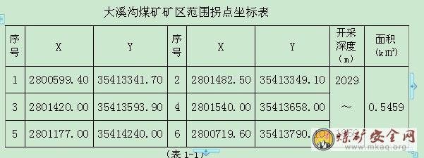 矿区范围为一不规则多边形,由6个拐点坐标圈定,矿区走向长宽880m,倾斜长900m,井田面积约0.5459Km2,开采深度+2029m至+1920m,其拐点坐标见表见表1-1。