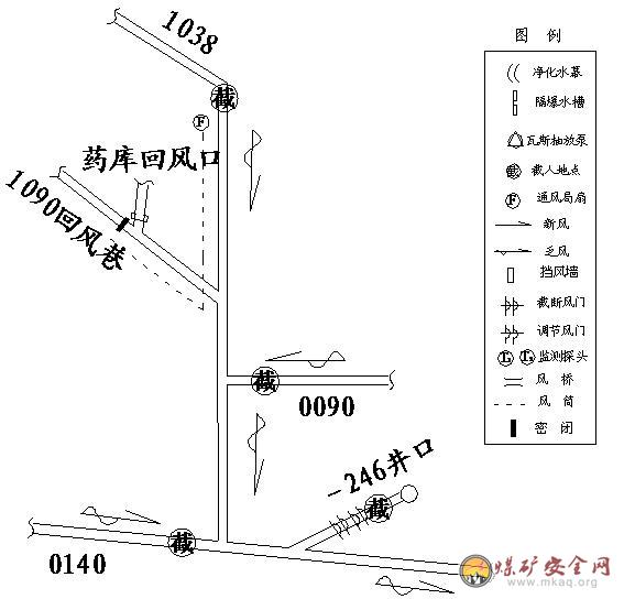 (4)密闭启封完毕后,检查1090回风巷通风系统风路是否畅通,经检查证实,整个巷道内风流中的瓦斯浓度不超过1.0%、氧气浓度不低于20%和二氧化碳浓度不超过1.0%,且稳定30min后瓦斯浓度没变化时,才可使局部通风机正常通风,综采队方可解除警戒,拆除警戒栅栏,并及时把现场情况如实详细汇报公司调度室和通风区调度室。