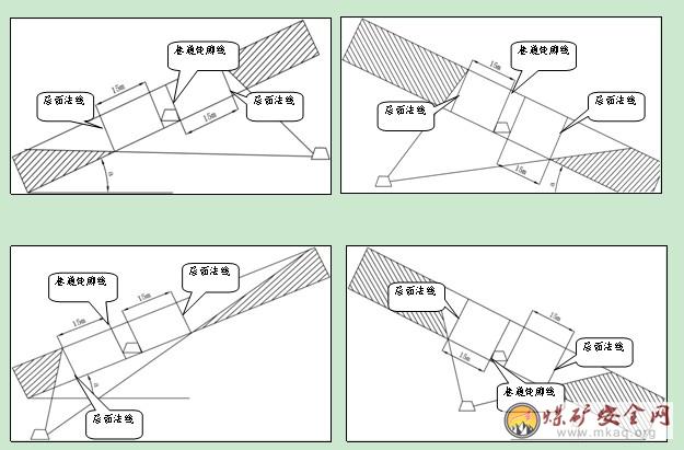 设计钻孔倾向与煤层倾向一致时,倾斜、急倾斜煤层,钻孔至少控制至煤层巷道上帮轮廓线外20m层面法线与底板交界处,下帮轮廓线外10m层面法线与顶板交界处;近水平、缓倾斜煤层钻孔应至少控制至煤层巷道上帮轮廓线外15m层面法线与底板交界处,下帮轮廓线外15m层面法线与顶板交界处。(见图3)