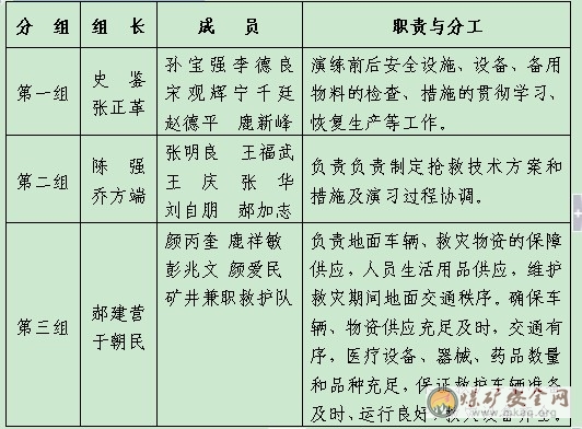 成立金阳煤矿火灾事故现场处置方案演练领导机构,总指挥为矿长李栋,副总指挥为史鉴、张正革、陈强、乔方端、孙宝强,下设3个小组,分工如下表: