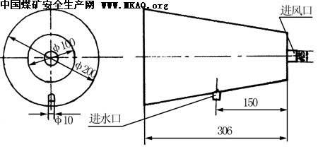其工作原理是利用φ25mm的高压软管将风水引射器入风口与高压风管连接,用φ10mm高压软管将风水引射器的入水管与静压水管连接,通过进入引射器的高压风将引射器的水流雾化喷射到工作面上隅角,搅乱上隅角及其后来采空区的风流涡流现象,在上隅角空间与工作面回风巷形成比较稳定的紊流状态的通道,将综合放顶煤上隅角的瓦斯带入工作面的回风巷。
