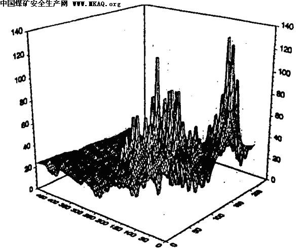 将野外实测的数据应用探火数据外理软件(CDTH)进行处理可得出火区分布平面图。图1、图2为测值立体图及相应等值线图,图3、图4为异常值为立体图及相应等值线图,以此可得出“五虎山煤矿404工作面自燃火源探测平面图”如图5所示: