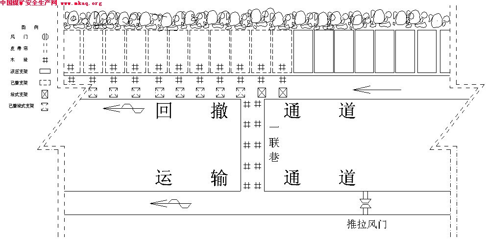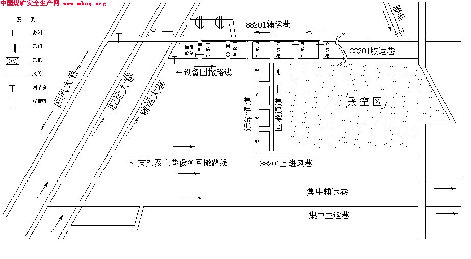 4)回撤通道内所有设备及液压支架回撤完毕后,方可拆除运输通道内的风门设施,并及时封闭两条通道以及88201工作面。