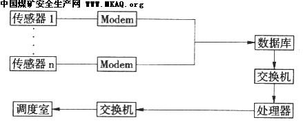 系统由数据采集、数据存储、数据处理以及预警等部分组成。图1是煤火预警系统构架图,图中的传感器是布控在关键地段的数据收集系统,包括上面提到的“束管”监测系统。收集的数据经调制解调器将数据通过井下的电话线路传送到数据库服务器并存储记录。中心电脑随时调用数据库中的最新序列数据,并根据建立的灰色预测模型进行预测,超