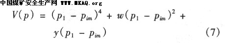 现在构造两个函数:w(?i,Ri)和y(E,ti,P2),其中w是单调减小的;y是分段函数;当P1-Pim>0时,单调增加,当P1-Pim<0时,单调减小(P>im为实际瓦斯压力)。煤与瓦斯突出可以适合尖点突变模型,则其突变势函数为
