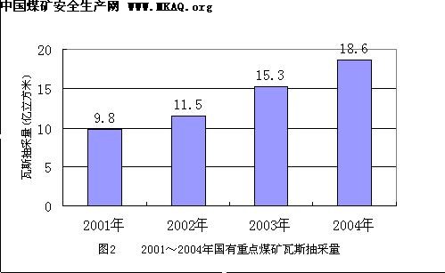 2、瓦斯抽采。初步建立了以钻孔和巷道抽采为主的瓦斯抽采技术体系。2004年,国有重点煤矿有地面抽采系统308套,井下移动抽采系统272套,瓦斯抽采量18.66亿立方米(见图2),抽采率26.5%。45户安全重点监控企业的高瓦斯、突出矿井全部装备了瓦斯抽采系统,瓦斯抽采量为16.95亿立方米,年抽采量超过1亿立方米的矿区有阳泉、淮南、水城、盘江、松藻、晋城、抚顺。山西大宁煤矿多分支水平井日抽采瓦斯近2万立方米,抽采率达70%以上。