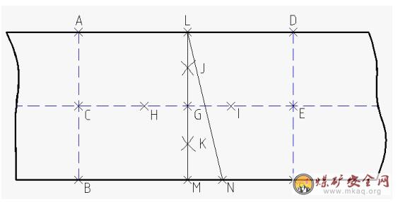 2、在硫化皮带的中心线LM两侧,距离1。2m的地方确定直线AB、DF,找出AB、DF中点C点、E点,连接CE两点,此时CE两点为皮带的中心线,并打好粉线。用皮带刀将皮带画好粉线AB、DF踢成V型槽,宽度5mm左右。