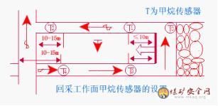 甲烷传感器应布置在巷道的上方,并应不影响行人和行车,安装维护方便。甲烷传感器应垂直悬挂,距顶板(顶梁)不得大于300mm,距巷道侧壁不得小于200mm,该巷道顶板要坚固、无淋水,否则,应增加防护措施。在有风筒的巷道中,严禁悬挂在风筒头和风筒漏风处。