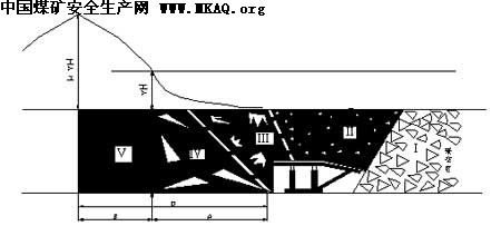 综放开采虽然采高较大,但工作面内采煤机落煤高度与分层开采并无多大差异,大量的顶煤借助矿山压力为动力通过后部输送机运出。因此在工作面后部有几倍采高的冒落顶煤被运走,使采空区空间较大,顶板形成的冒落带高度远大于分层开采,使采空区支撑应力恢复明显延长,由工作面开采引起的应力降低区扩大,应力从新分布区值提高,从而有更多的矿山压力集中作用在煤壁前方,使煤壁前方的应力集中带向煤壁深部转移,如图2示。