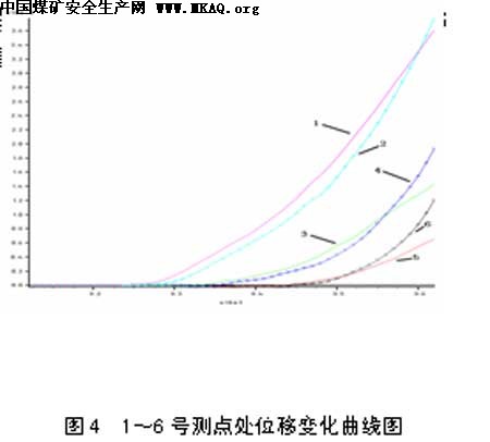 图4为布置在模型回采巷道围岩部分测点处位移变化曲线图。其中1~6号测点布置在6303顺槽实体煤侧,它们从掘进6303顺槽开始,一直记录到工作面推进距2、4、6号测点4m处。其中1、2号测点距煤帮6m,3、4号测点距煤帮10m,5、6号测点距煤帮14m。它们记录的位移变化情况如图4所示。 从图4中可以看出:在顺槽掘进至工作面切眼完成阶段,明显出现位移为1、2号测点处,其原因是1、2号测点距煤帮仅6m,顺槽掘进使其围岩应力集中,1、2号测点处受其影响从而产生变形。3、4、5、6号测点位于围岩深部,此时基本不受影响。由于1号测点附近顺槽先被掘出,1号测点的位移数值略大于2号测点。随着工作面的推进,回采巷道围岩的应力集中区逐渐向深部转移。3、4号测点处也产生位移,5、6号测点处不受影响,1、2号测点处位移逐渐增大。对回采巷道采用卸压方案后,应力集中区进一步向围岩深部转移。5、6号测点处也产生位移。1、2、3、4号测点处位移值明显增大。在工作面推进至距2、4、6号测点4m处,这三点处位移值都急剧上升说明煤壁前方4m处煤体已发生塑性破坏。