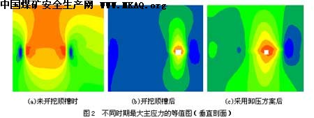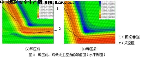 由于FLAC软件是静态有限差分程序,它对爆破动态作用过程无法处理,因此,本文在模拟过程中,对爆破范围内的顶板与煤体采用了弱化措施,即在模型计算过程中降低相应单元的强度和弹模。图2(c)为采取卸压措施后的最大主应力等值图。