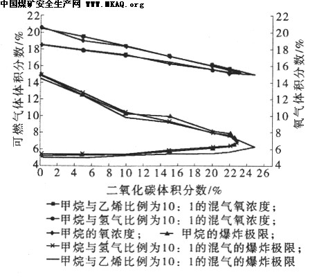 图1 中纯甲烷在加入二氧化碳后临界爆炸极限氧体积与甲烷与氢气比例为10:1的混气在加入二氧化碳后临界爆炸极限氧体积相比变化不大;说明氢气的加入,对甲烷临界爆炸极限氧浓度氧体积分数的影响不大,对甲烷的爆炸危险性影响不大。纯甲烷在加人二氧化碳后临界爆炸极限氧体积与甲烷与乙烯比例为10:1的混气在加入二氧化碳后临界爆炸极限氧体积相比,变化较大,甲烷与乙烯比例为10:1的混气在加入二氧化碳后临界爆炸极限氧体积比纯甲烷在加入二氧化碳后临界爆炸极限氧体积低一些,也就是说,在临界爆炸极限状态下甲烷与乙烯比例为10:1的混气爆炸所需要的氧气量要少一些,说明在甲烷中加入乙烯后,会