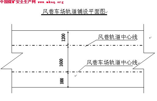 3、风巷车场轨道中心线距风巷下帮1000mm,车场轨道中心线与风巷轨道中心线间距1600mm,风巷轨道中心线距风巷上帮1200mm。