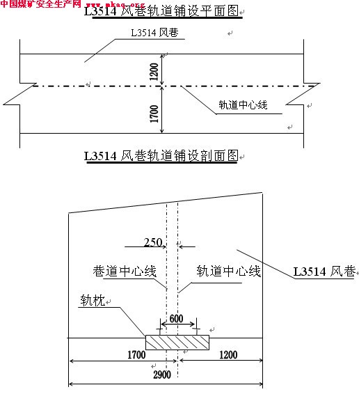 2、风巷轨道设计中心线距上帮1200mm,距下帮1700mm。