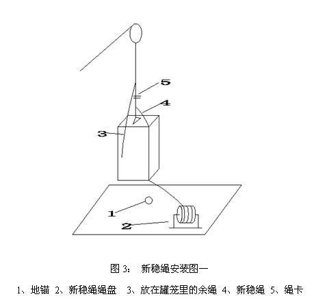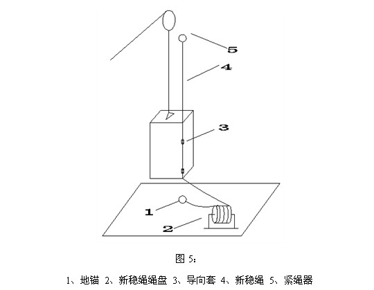 3、待新稳绳在紧绳器上做初步紧固后,然后再将导向套安装上去,并更换尼龙瓦座。再将新稳绳与主绳卡接的绳卡卸下。然后将新稳绳盘的下部与地锚相接,如绳太长,可在新稳绳下部将绳剁掉。最后调整紧绳器,紧固稳绳,并确保稳绳不歪斜。(见图5)