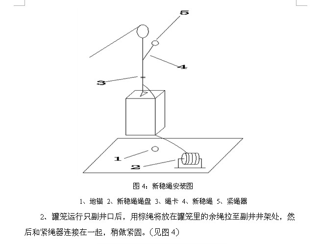 1、事先将新稳绳盘好,并制作成如图所示的滚筒架子,并将其放在副井筒底部。旧稳绳拆除完毕后,将新稳绳的一头抽出,与主绳用完好的绳卡做上卡接。如图所示,要保证在放在罐笼里的余绳长度大于20m(此处余绳是留从罐笼到副井井架天轮用的)。然后罐笼缓缓上提,工作人员在新稳绳绳盘处慢慢放绳,罐笼上提速度和放绳速度要一致,并且速度不允许过快。(见图3)