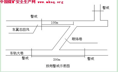 1、每次爆破前,必须由班长亲自安排专人在东轨大巷、东翼总回风巷贯通点位置两边安全位置做好警戒;做好警戒后,专人联系放炮;炮后,由专人联系撤除警戒;非经该班长同意,严禁私自撤除警戒人员。同时,放炮期间停止皮带运转,预防皮带事故。警戒位置见示意图一。