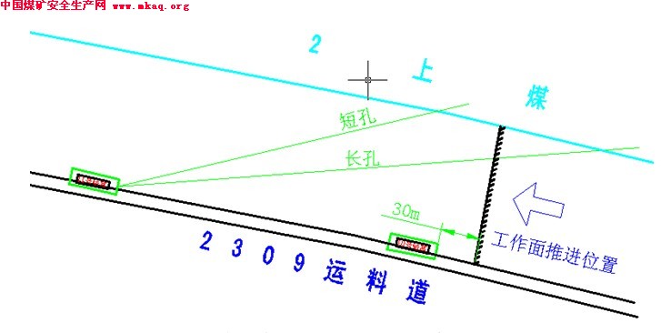 通过前期大量施工钻孔数据证明,我矿2309工作面2上煤层距大煤顶板26米左右。随着工作面推进、老顶垮落,顶板产生裂隙也随之逐渐增多、增大,2煤及2上煤的瓦斯随裂隙涌出。因此,将钻孔终孔位置设于2上煤层或接近2上煤层的位置,当抽放系统工作时,该工作面由于采动涌出的瓦斯因抽放形成的负压沿着大量裂隙被抽出,随采随抽,故抽放效果较好。