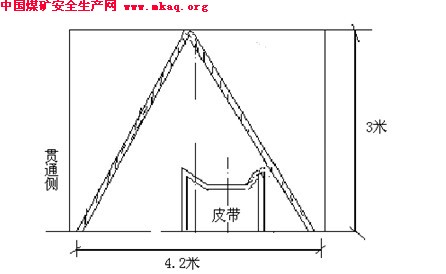 贯通地点保护皮带及电缆管路措施: 1、保护范围贯通点前后7.5米。用废旧的4寸管加工成“人”字形棚子,棚子采用4寸管当立柱,2寸管当横撑,立柱排距1米,横撑间距0.5米,加工牢固,上面铺严双层旧皮带。人字形棚子底部距离透口帮500mm,另一侧支在另一帮底部。 2、电缆保护,将贯通点前后10米范围内电缆落地放入棚子内,并在上面铺严皮带。 3、人字形棚子距离皮带300mm ,严禁依靠皮带打保护。以防皮带位移。 4、皮带保护棚子示意图