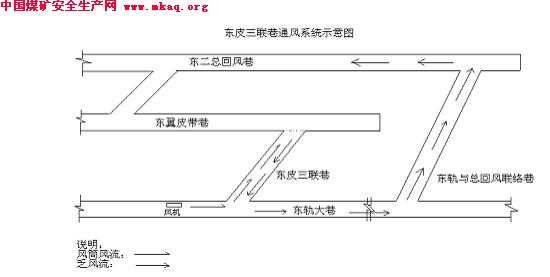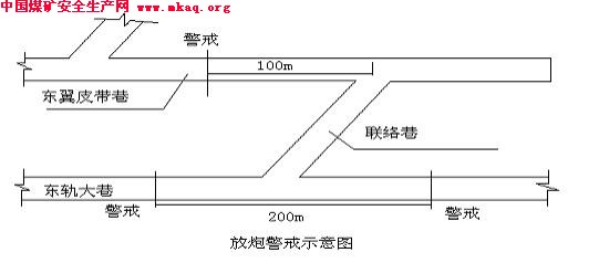 6.执行放炮的安全规定,并严格执行“一炮三检查”制度。7.通风区巡检的瓦检员必须加强贯通地点的瓦斯检查,并对贯通措施的执行情况进行严格检查和督促落实。对于风筒及瓦斯管理出现的隐患和质量问题,可采取停工处理的方式,确保贯通地点有足够的有效风量及瓦斯情况符合规定。8.贯通后,通风区组织人员立即调整通风系统,关闭风门,实现全风压通风,并检查风量和瓦斯浓度,风流稳定后,方可恢复工作。三、爆破安全措施:1、每次爆破前,必须由班长亲自安排专人在东轨大巷、东翼皮带巷贯通点位置两边安全位置做好警戒;做好警戒后,专人联系放炮;炮后,由专人联系撤除警戒;非经该班长同意,严禁私自撤除警戒人员。警戒位置见示意图一。2、坚持少装药放小炮。3、平巷掘进里透口处剩5米处,巷道两帮、巷中要先用3米钎子打3个探眼,探透后及时调整爆破参数改变炮眼起爆量及装药量。4、每次最多放3个炮眼,装药量执行掏槽3卷,辅助2卷,周边1卷。四、贯通地点保护管路措施:将贯通点前后10米范围内的风水管路拆除。五、其他:贯通前要结合通风区,由通风区负责拆除东翼皮带巷密闭,并负责瓦斯排放工作,我单位跟随通风区负责东翼皮带巷内排水工作。六、巷道贯通及警戒示意图