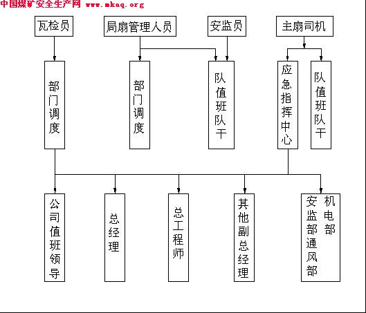 工程师的指挥下负责各自范围内的技术工作。 4、安全、通风、机电、生产地质技术部部长负责全面落实各自业务范围内的具体工作。 5、应急指挥中心负责全面统一协调、落实领导安排的各项工作的进展情况,并有详细记录。 6、分管调度的助理负责全面掌握调度的各种台帐记录情况,并落实各级领导部门安排工作的执行情况。 四、主扇无计划停风汇报程序