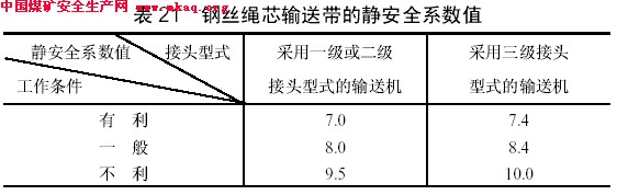 (二)钢丝绳芯输送带的静安全系数,不得小于表21中的数值。