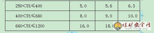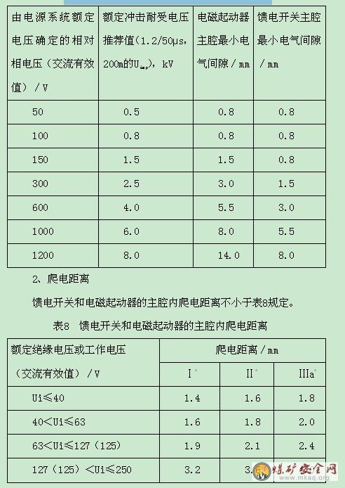 表7 馈电开关和电磁起动器主腔内电气间隙