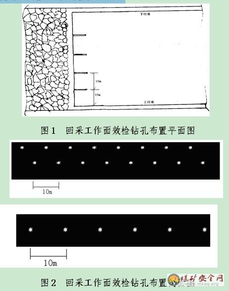 当顶煤厚度大于或等于3m时,布置两排预测钻孔,钻孔自上付巷口以下10m处开始,单排每10m布置一个钻孔,下排钻孔布置在采面中部,钻孔沿采面推进方向施工,平行于煤层顶板。上排孔布置在距采面顶0.5m处,钻孔沿采面推进方向向上倾角25°。两排钻孔采用三花眼布置方式。